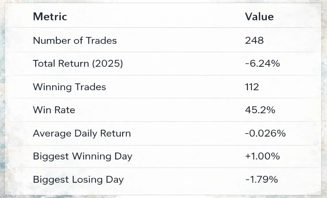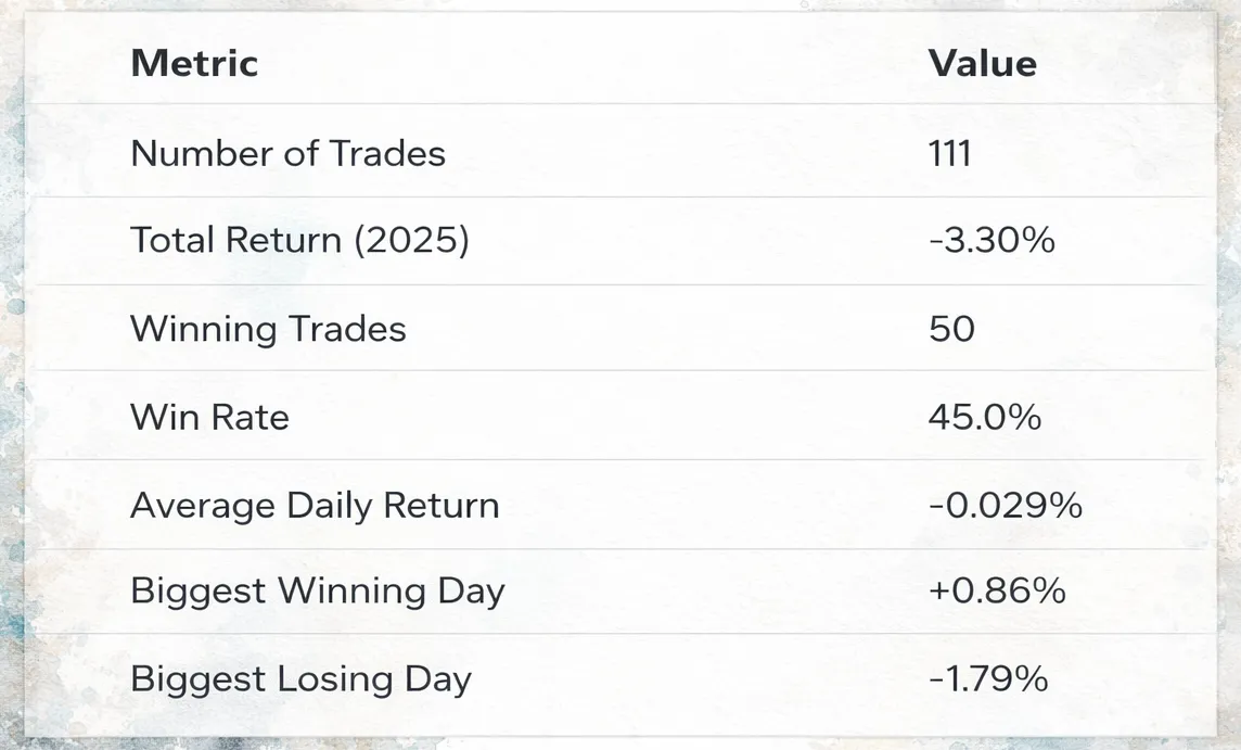 Even with this higher-threshold filter, the results improved but the strategy still lost money in 2025, ending down -3.30%.