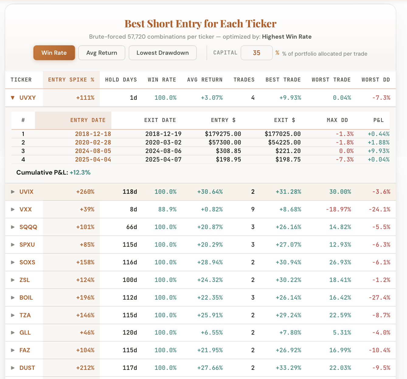 It tests every possible entry and exit combination to find the optimal spike trade for each ticker.