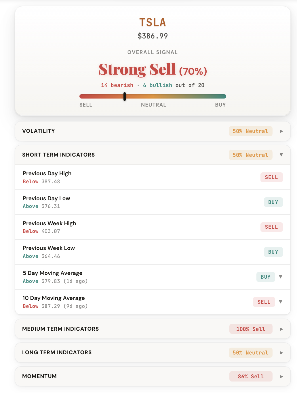 Select a ticker and every tool runs at once. The results appear on a single page, organized into clear signal cards.