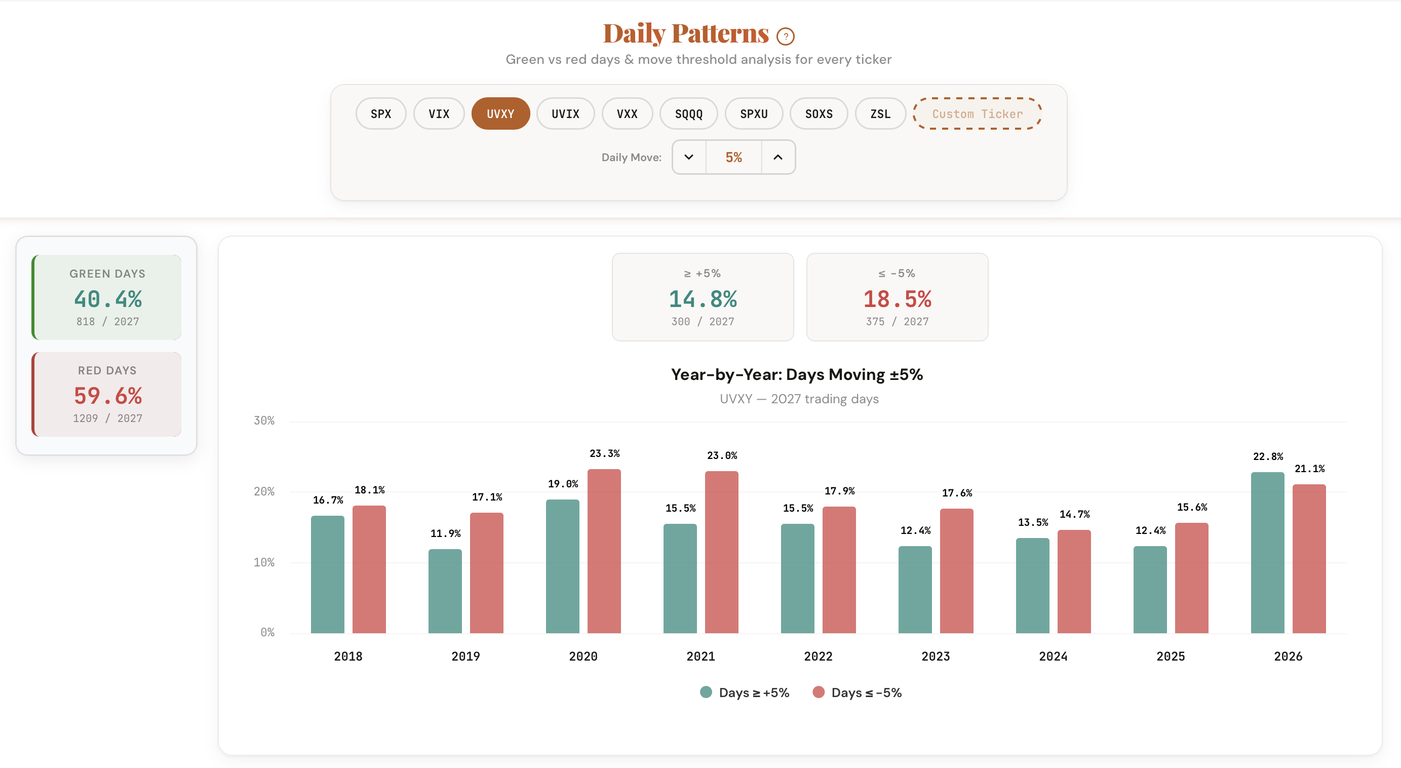 Green vs red day ratios, move threshold analysis, and year-by-year breakdowns for every ticker.