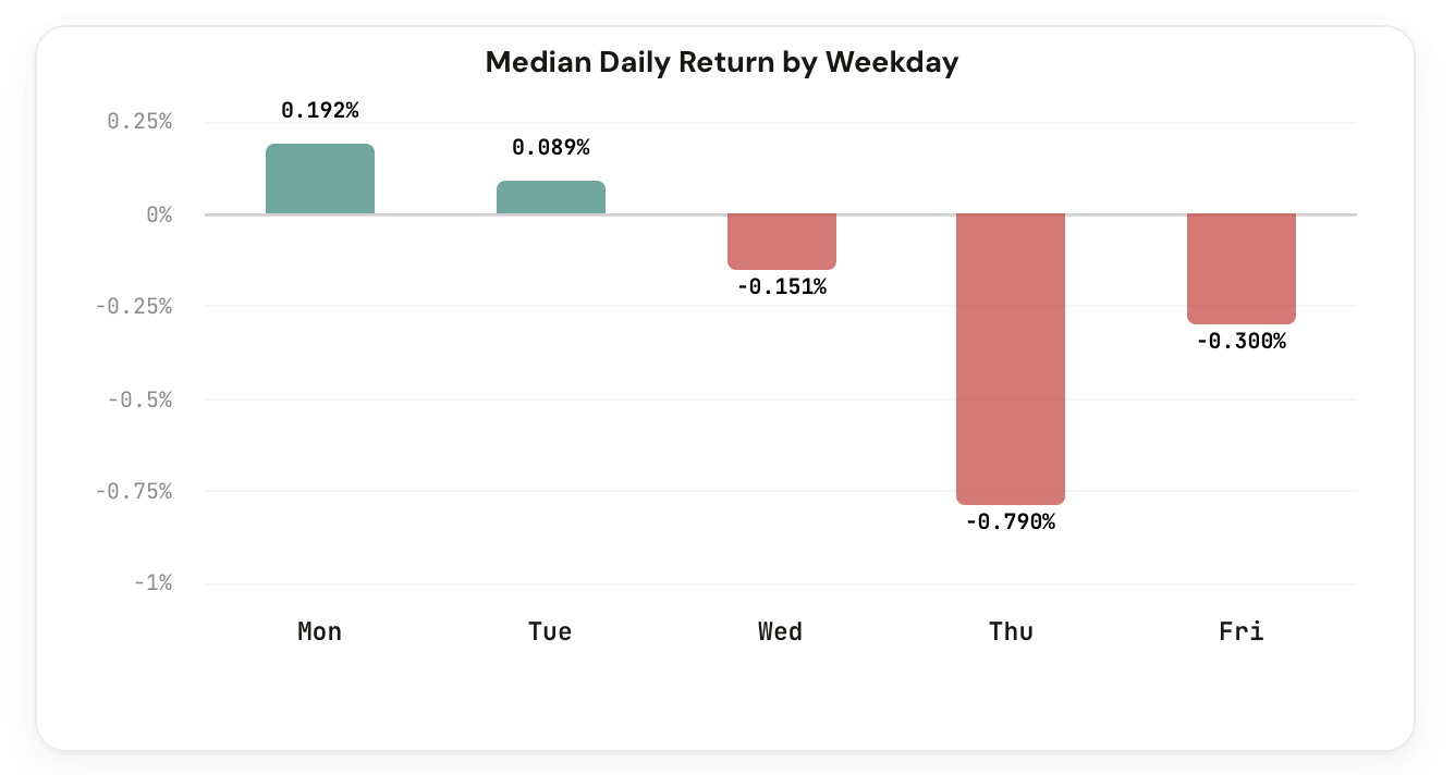 Day-of-week return patterns for every leveraged and inverse ETF, backed by years of data.