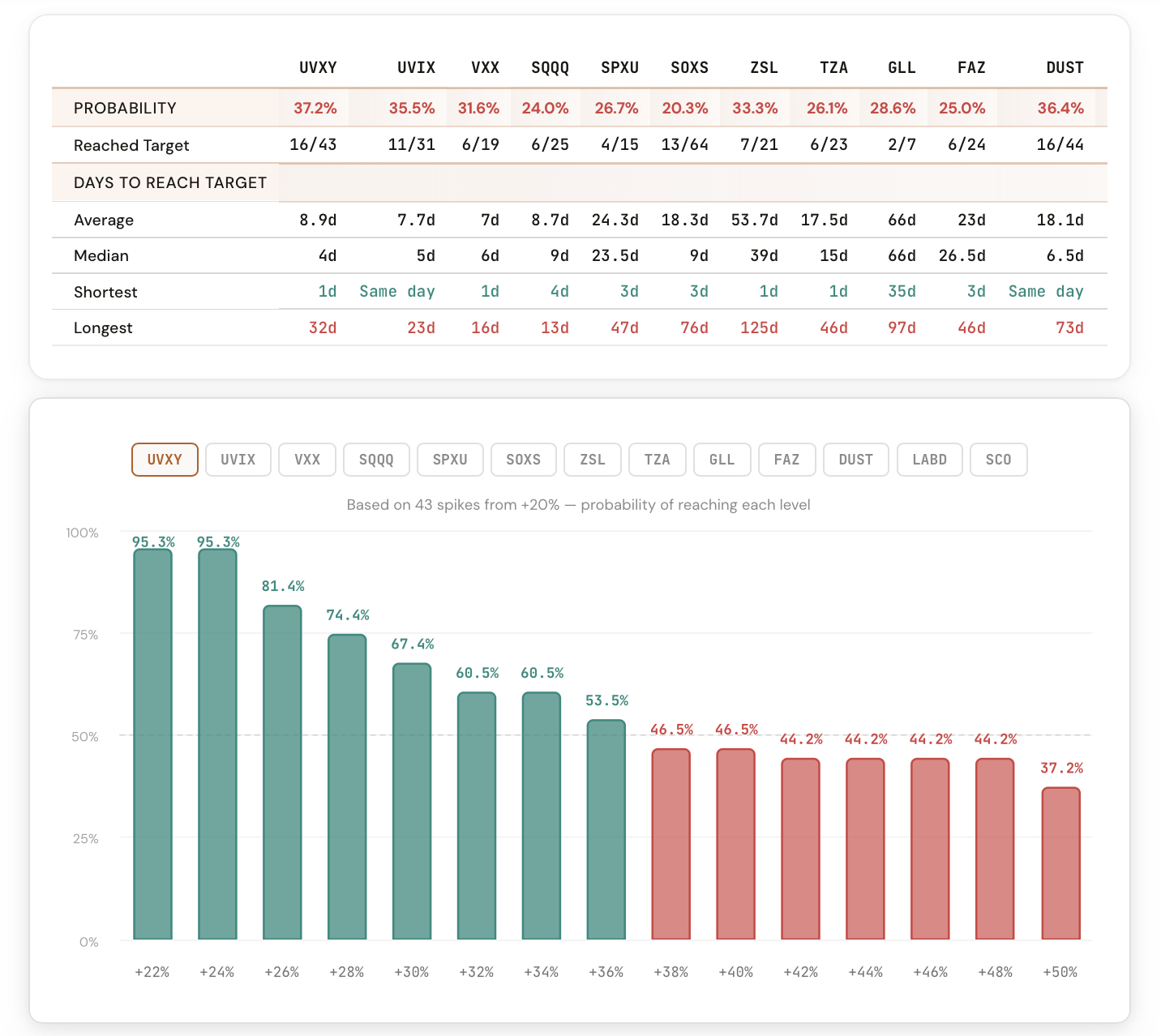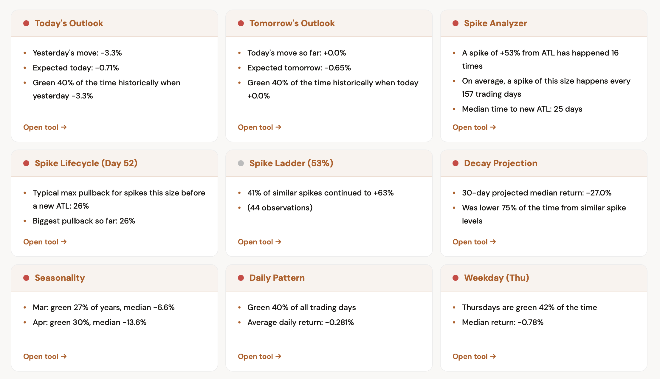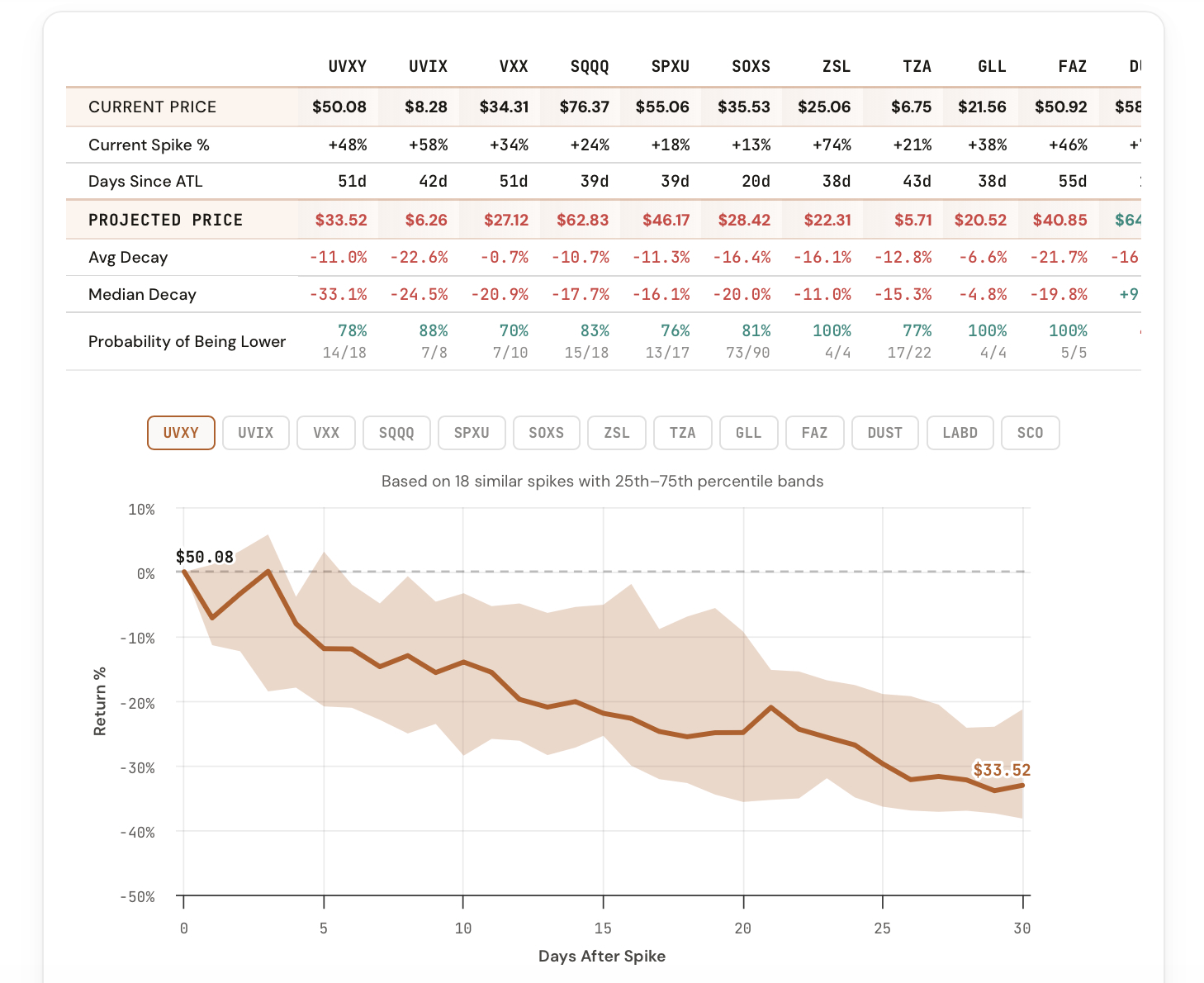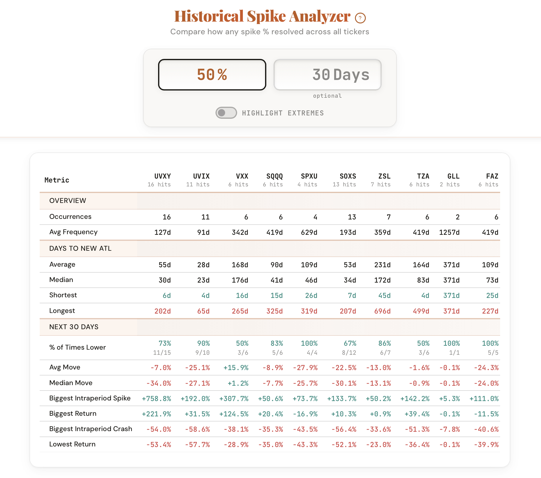 We just launched the Spike Analyzer. Enter any spike percentage and compare how it resolved across every ticker.