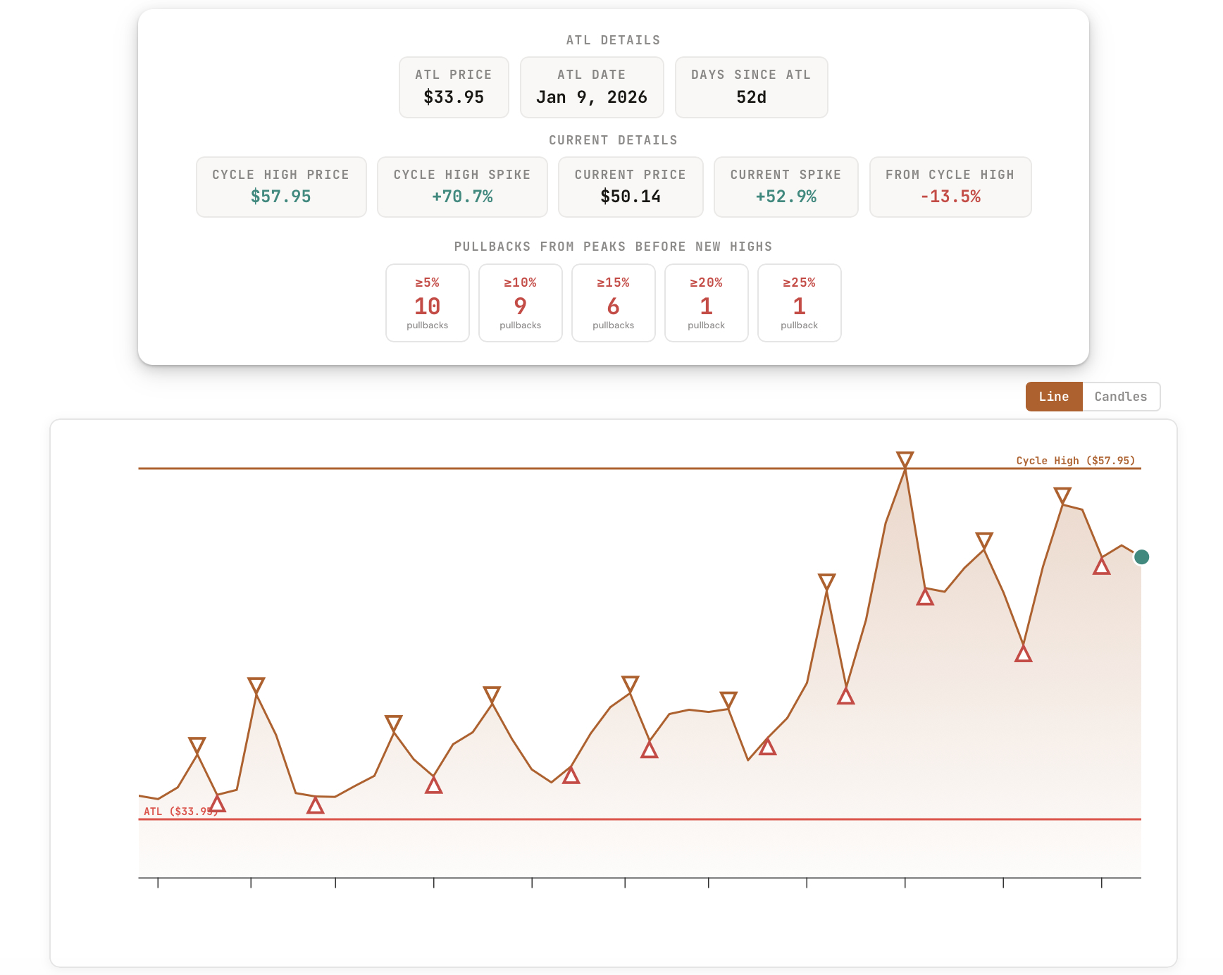 See the current cycle from all-time low to present, with peaks, pullbacks, and historical context.