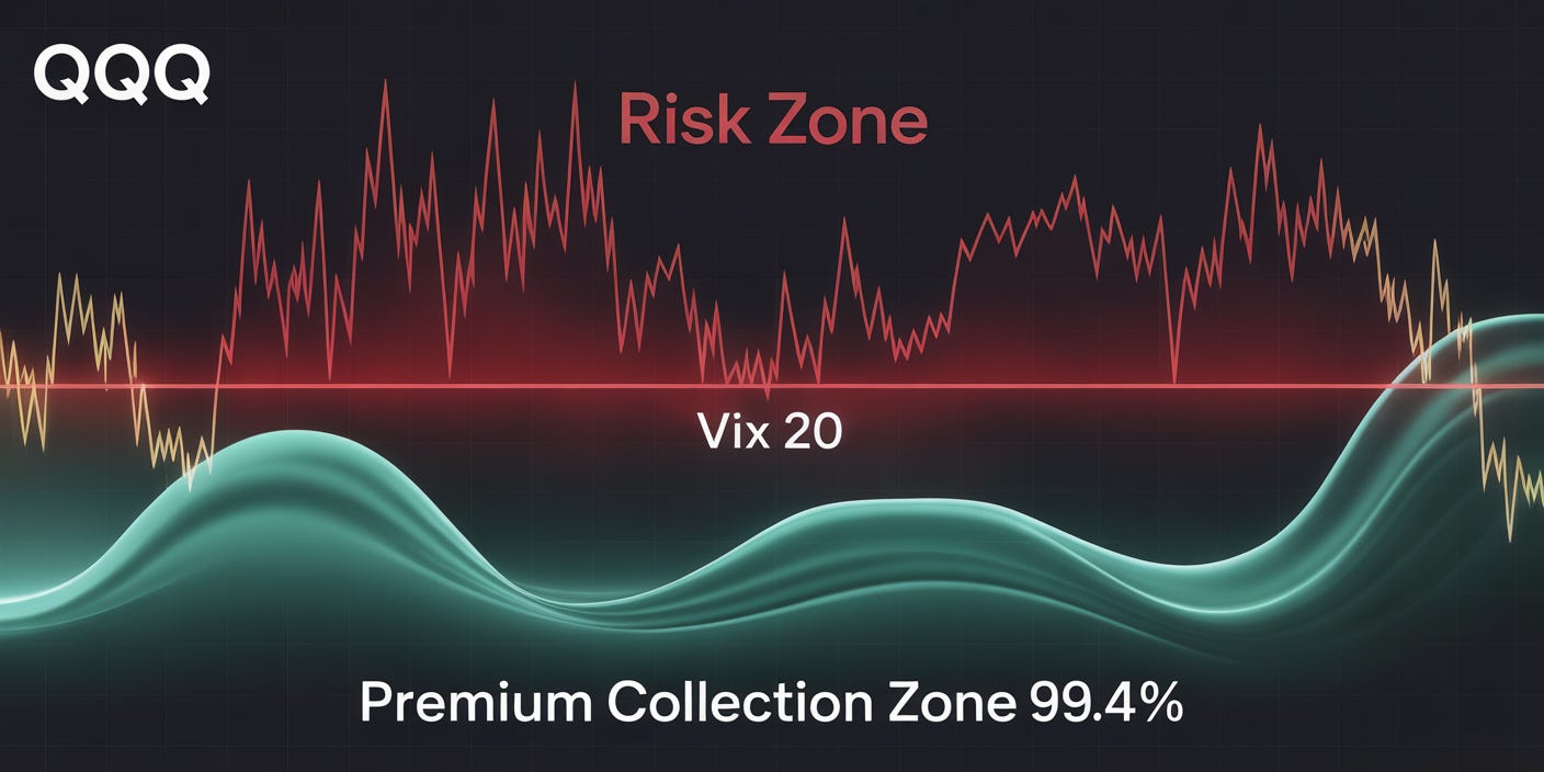 Trading StrategiesWeekly Premium Selling Strategy for QQQ using VIX99.4% of these options expire worthlessCI Volatility InvestmentsOct 28, 2025∙ PaidShareWe analyzed 11+ years of QQQ daily data (2,886 trading periods from 2014-2025) to quantify exactly how safe it is to sell out-of-the-money options in different VIX regimes.The results make a compelli…This post is for paid subscribersSubscribeAlready a paid subscriber? Sign inPreviousNext