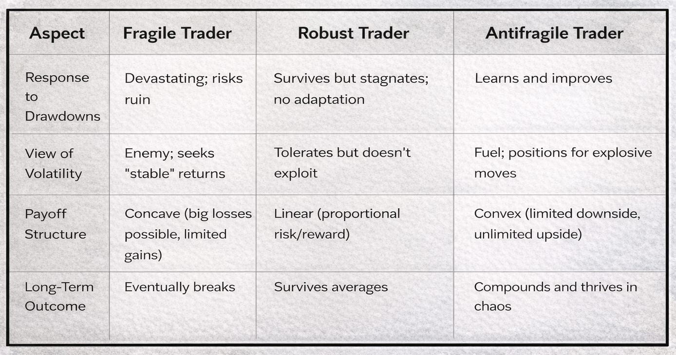 In the trading environment, fragile or merely robust traders eventually fail. To survive and thrive long-term, traders must build antifragile approaches.