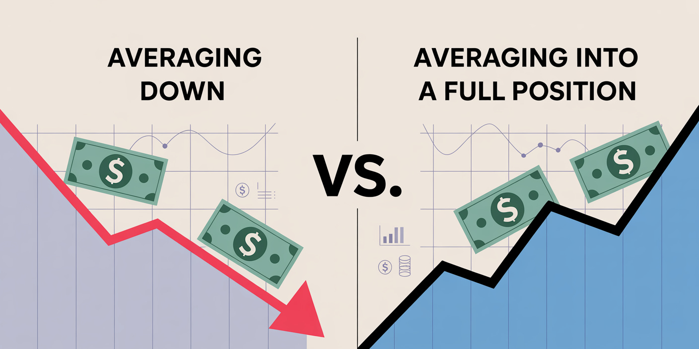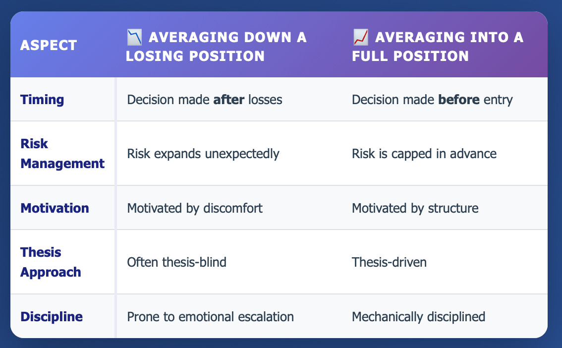 Averaging down into a full position is fundamentally different because the decision happens before the first buy.