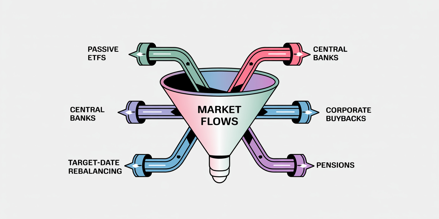 Passive Investment Inflows: These flows are mostly from retirement accounts and other pension contributions. For example, when you put money in a 401(k), it buys shares of big companies (e.g., Apple or Nvidia) without caring if they’re expensive.