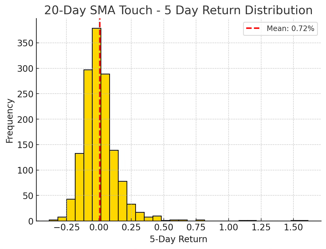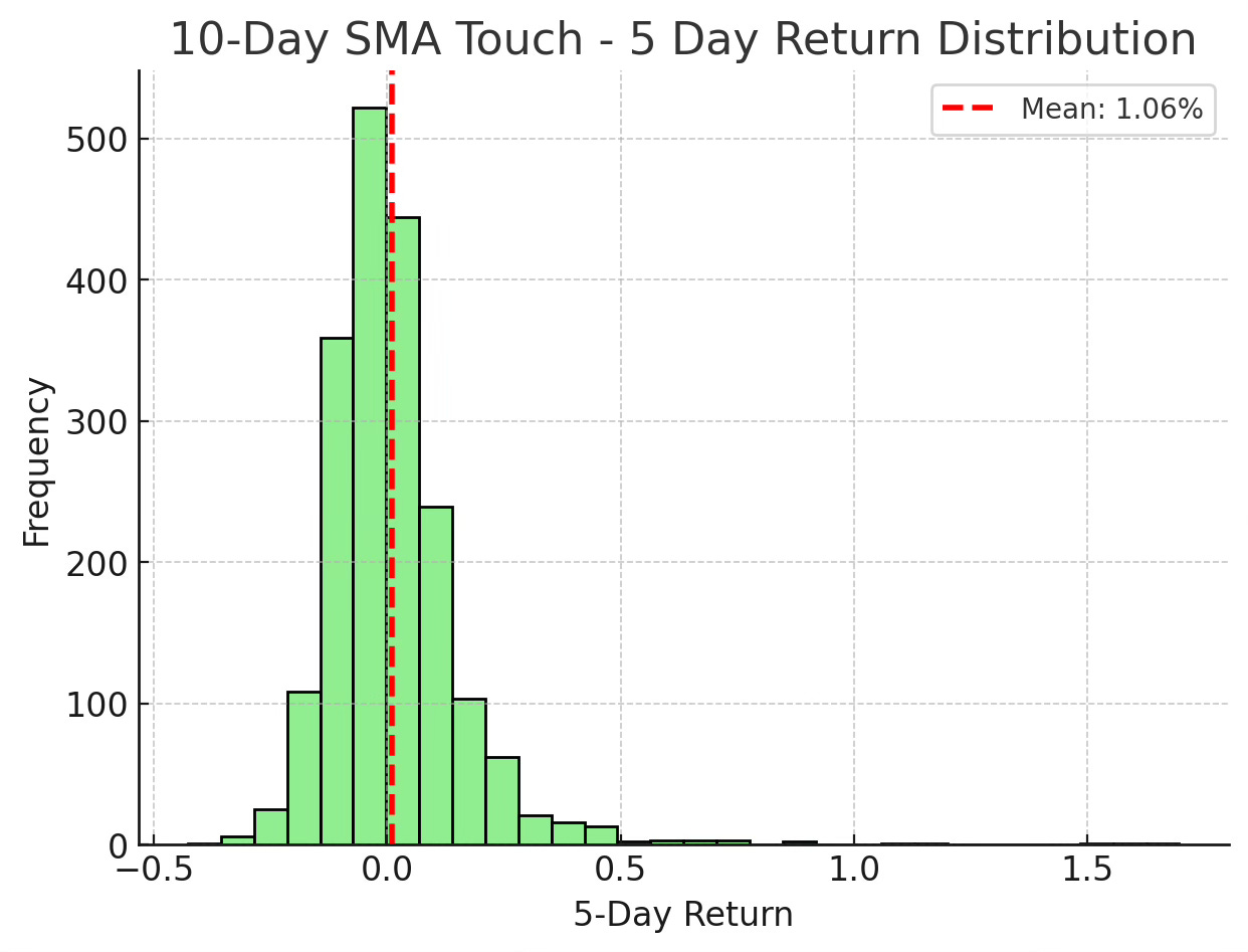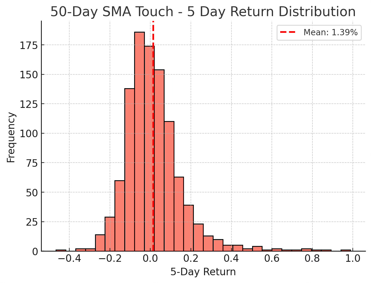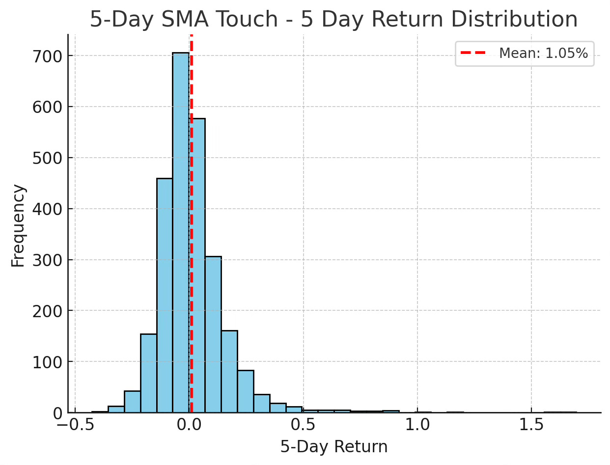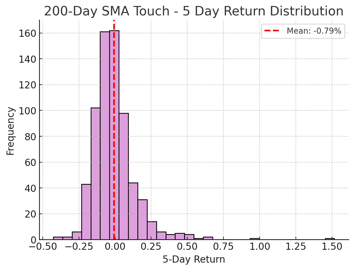 Longer averages matter more. Touching the 200-day SMA often signals a calming period, with a bias toward declines in the following week.