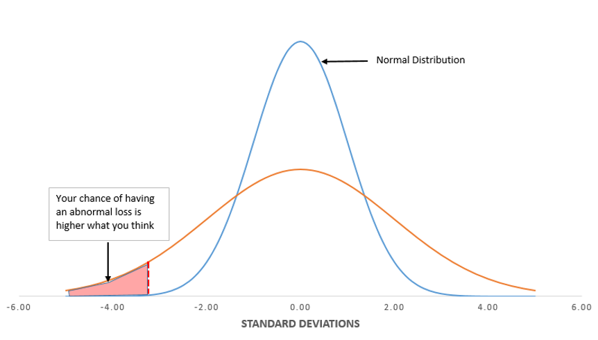 In markets, “tail risk” typically refers to left-tail risk—the rare but severe crashes that can erase months or years of gains. The chart above shows roughly 68% of returns clustering within normal distribution parameters (the blue lines), but it’s the small percentage of extreme outcomes in the left tail that inflict disproportionate damage.