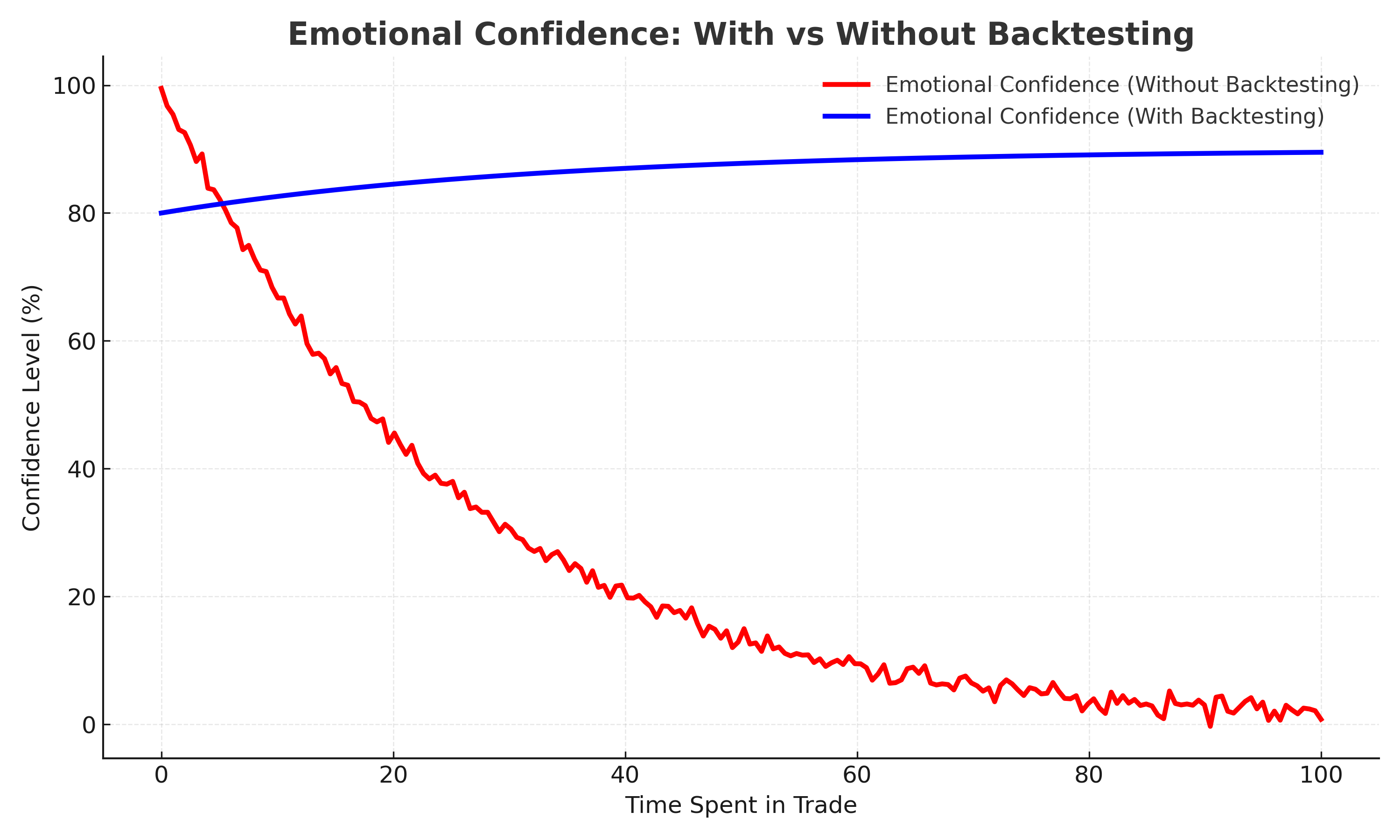 This chart illustrates how emotional confidence evolves over time with and without backtesting. The red line shows how confidence typically erodes the longer you hold onto a trade when traders rely solely on emotion.