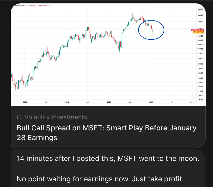 With Microsoft’s fiscal Q2 2026 earnings set for after the close on January 28, could this be the catalyst for a meaningful move? Historical post-earnings moves average around 5%, so volatility is likely.