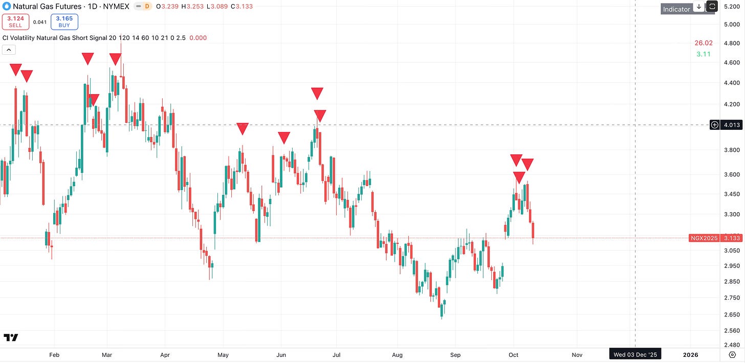 Our Natural Gas (NG) short setup has shown a near 100% hit rate when traded short-term — typically within a one-week window.