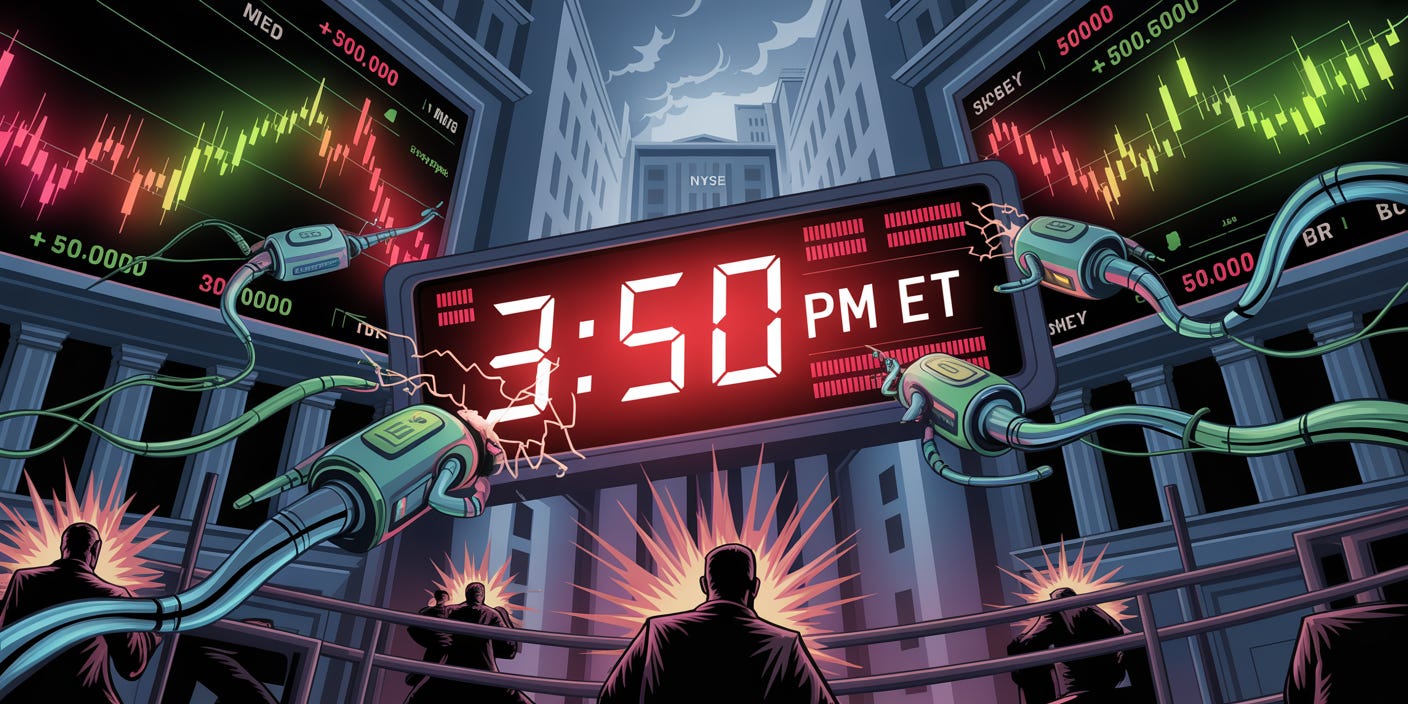 If you watch the markets every day, you’ve probably noticed it — that weird, chaotic burst of activity around 3:50 p.m. Eastern. Stocks start whipping around, spreads widen, and for a minute or two, it feels like the algos have completely taken over.