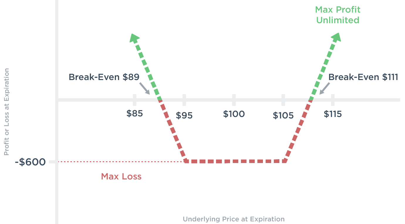 Setup: Similar to a straddle but with out-of-the-money (OTM) calls and puts (different strikes).