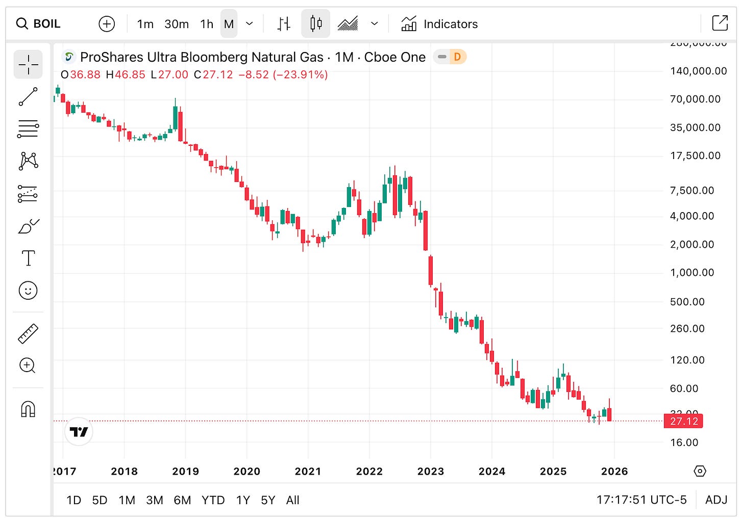 Despite periodic massive spikes in natural gas prices (e.g., during the 2022 energy crisis), BOIL has lost the vast majority of its value over time.
