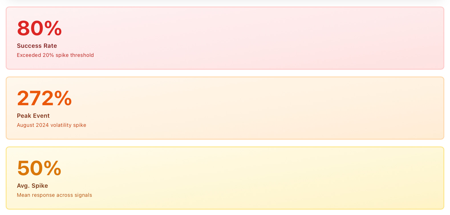 When the right combination of search terms reaches extreme levels simultaneously, we noticed in 80% of cases, the VIX surged by at least 20% within days. One signal even preceded the most dramatic volatility explosion in recent market history.