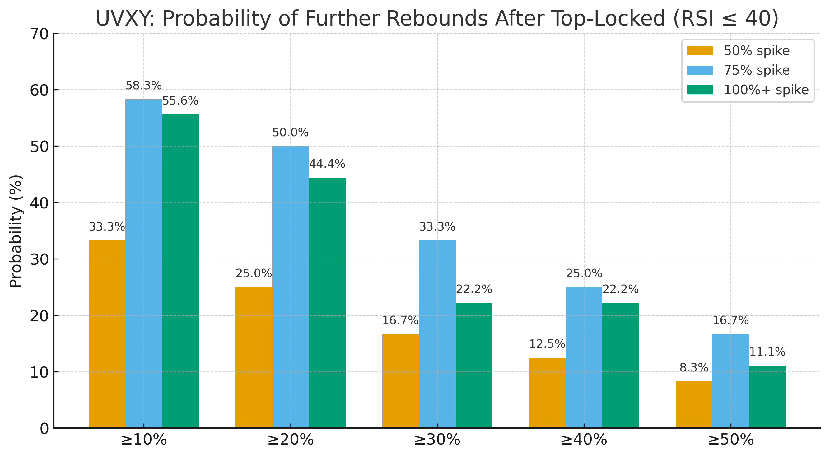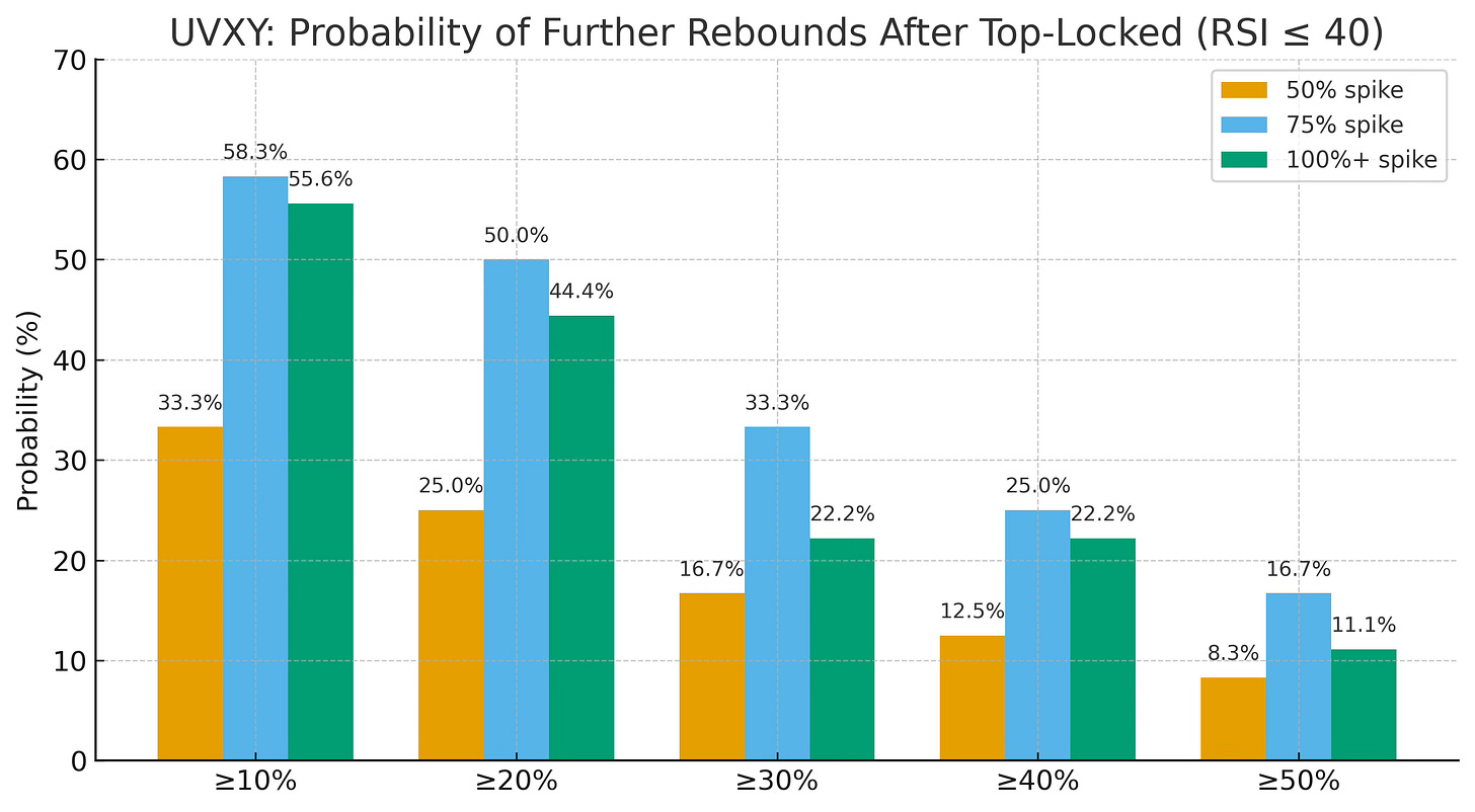 Premium Research LibraryProbability Of Further UVXY Spikes Once The Top Is Already InBacktested 2013-2025CI Volatility InvestmentsSep 26, 2025∙ PaidShareEven after a UVXY spike tops, reflex spikes are common. How often does UVXY still pop by ≥10%, ≥20%, ≥30%, ≥40%, ≥50% before the next all-time low?Here are the probabilities after the top is in:This post is for paid subscribersSubscribeAlready a paid subscriber? Sign inPreviousNext