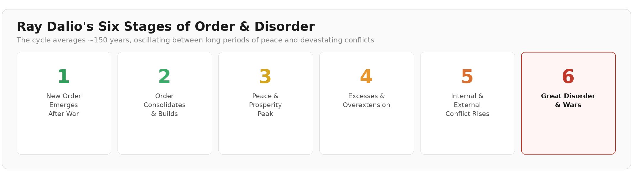 Dalio argues that the post 1945 world order has officially broken down, citing declarations from leaders at the 2026 Munich Security Conference. He frames this as Stage 6 of his “Big Cycle,” a period where rules collapse, might makes right, and great powers clash.