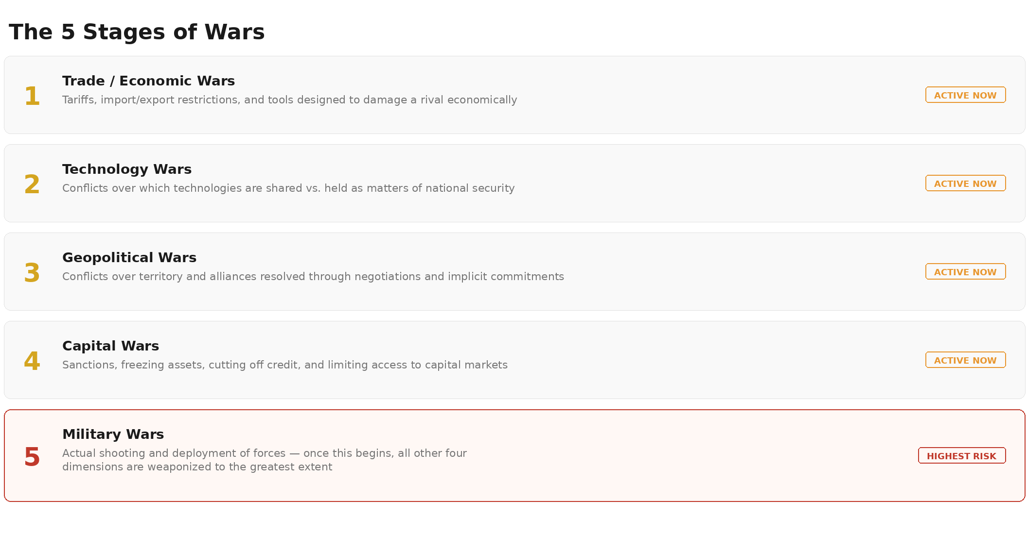 He identifies five types of wars that tend to escalate in sequence with each one raising the stakes for the next.